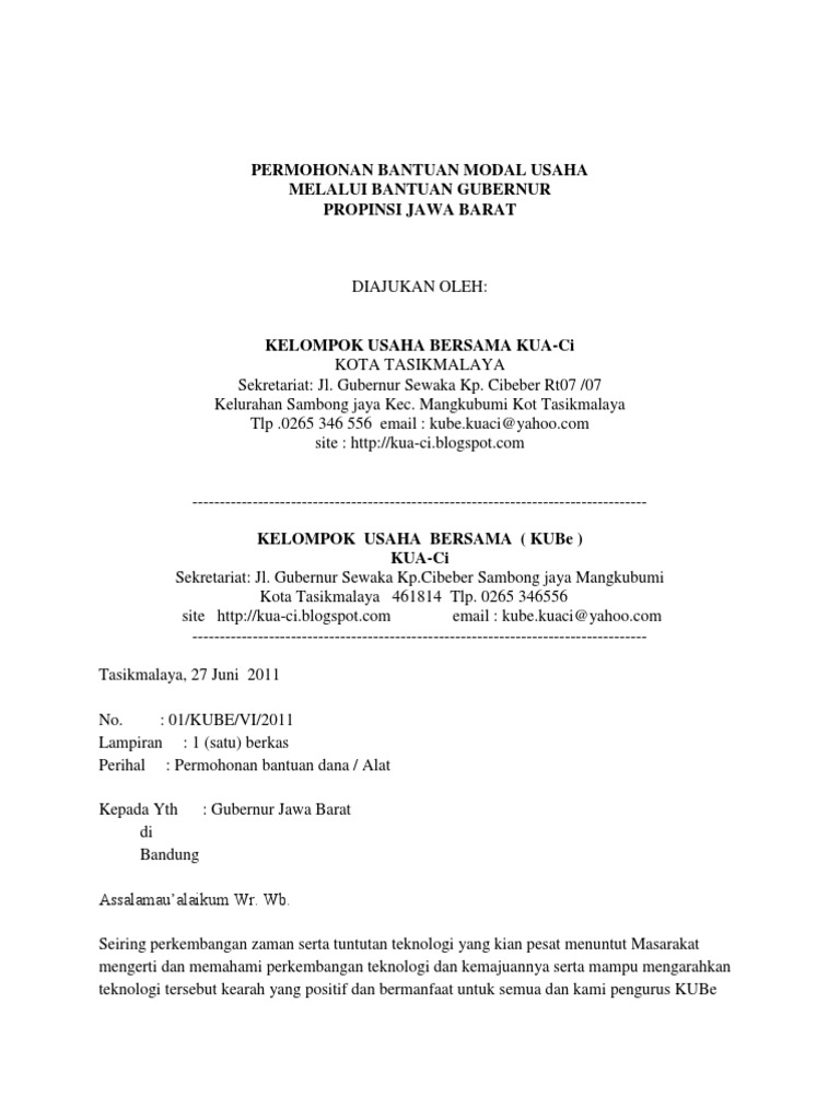 SIDE424: proposal pengajuan bantuan dana pengembangan usaha... Perihal : Permohonan Bantuan Sosial. Pengembangan Usaha Bagi. Kelompok Perempuan Pengusaha. Dengan ini mengajukan permohonan bantuan sosial pengembangan usaha bagi kelompok Perempuan Pengusaha Mikro kepada Pemerintah Provinsi Jawa Barat melalui Dinas... Contoh Proposal Usaha / Kewirausahaan / Bisnis [Cara Membuat...] Tujuan pembuatan proposal. Permohonan bantuan dana dari Bina Lingkungan / ESR. Salah satu ciri usaha yang baik adalah memiliki laporan keuangan yang baik. Laporan tersebut meliputi alokasi dana, perhitungan laba, dan perhitungan bagi hasil.