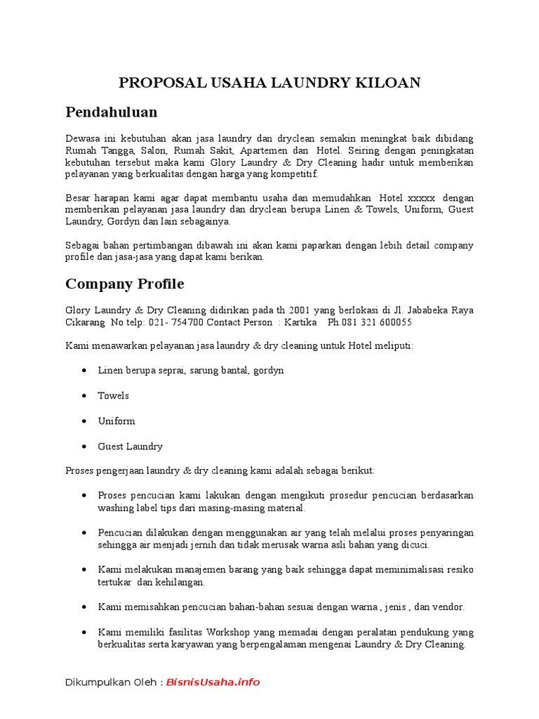 (PDF) proposal usaha laundry proposal usaha laundry | andi ... proposal usaha laundry PROPOSAL BISNIS LAUNDRY & DRY CLEANING Surakarta, 18 November 2012 Kepada Yth, Para Investor / Bank BRI Di Tempat Dengan Hormat, Perihal: Laporan Studi Kelayakan Bisnis Laundry & Dry Cleaning Bersama surat ini kami kirimkan proposal studi kelayakan bisnis dalam bid ang usaha Laundry & Dry Cleaning.