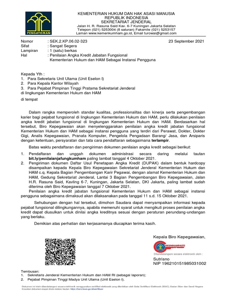 Permen PAN & RB No. 48 Tahun 2014 tentang Jabatan ... Permen PAN & RB No. 3 Tahun 2009 tentang Jabatan Fungsional Arsiparis dan Angka Kreditnya Tentang. Database Peraturan ini merupakan bagian dari pelaksanaan JDIH di lingkungan BPK RI. Secara khusus dimaksudkan untuk menyebarluaskan informasi peraturan perundang-undangan dan dokumentasi hukum secara mudah, cepat dan akurat kepada para pengguna ... Jabatan Fungsional Arsiparis Dan Angka Kreditnya - Info ASN Arsiparis adalah seseorang PNS yang memiliki kompetensi di bidang kearsipan yang diperoleh melalui pendidikan formal dan/atau pendidikan dan pelatihan kearsipan serta mempunyai fungsi, tugas, dan tanggung jawab melaksanakan kegiatan kearsipanyang diangkat oleh pejabat yang berwenang di lingkungan lembaga negara, pemerintahan daerah, pemerintahan desa dan satuan organisasi perguruan tinggi negeri. Jabatan Fungsional adalah sekelompok jabatan yang berisi fungsi dan tugas berkaitan dengan pelayanan fungsional yang berdasarkan pada keahlian dan keterampilan tertentu. Jabatan Fungsional Arsiparis adalah jabatan fungsional tertentu yang mempunyai ruang lingkup fungsi, dan tugas, tanggungjawab, dan wewenang untuk melaksanakan kegiatan kearsipan pada Lembaga Negara, Pemerintahan Daerah, Pemerintahan Desa,dan Perguruan Tinggi Negeri. Arsiparis Kategori Keterampilan adalah Arsiparis dengan kualifikasi teknis atau penunjang profesional yang pelaksanaan fungsi dan tugasnya serta kewenangannya m... Contoh Menghitung Angka Kredit (PAK ... - rinosafrizal.com Angka Kredit berdasarkan Penilaian Kinerja Ketua Program Keahlian 5.1 Rumus menghitung AK dari Penilaian Kinerja Ketua Program Keahlian. Instrumen Penilaian Kinerja Ketua Program Keahlian, terdiri atas 8 kompetensi yang dijabarkan dalam beberapa indikator dengan jumlah skor maksimal 32. Instrumen PK Ketua Program Keahlian selanjutnya dikonversi ... SE BKN No.3/SE/II/2021 Penyusunan Sasaran Kerja Pejabat ... Pelaksanaan tugas dan fungsi koordinasi oleh pejabat fungsional yang terkait diberikan tambahan angka kredit sebesar 25% (dua puluh lima persen) dari angka kredit kumulatif untuk kenaikan pangkat setingkat lebih tinggi dan diakui sebagai tugas pokok dalam penetapan angka kredit.