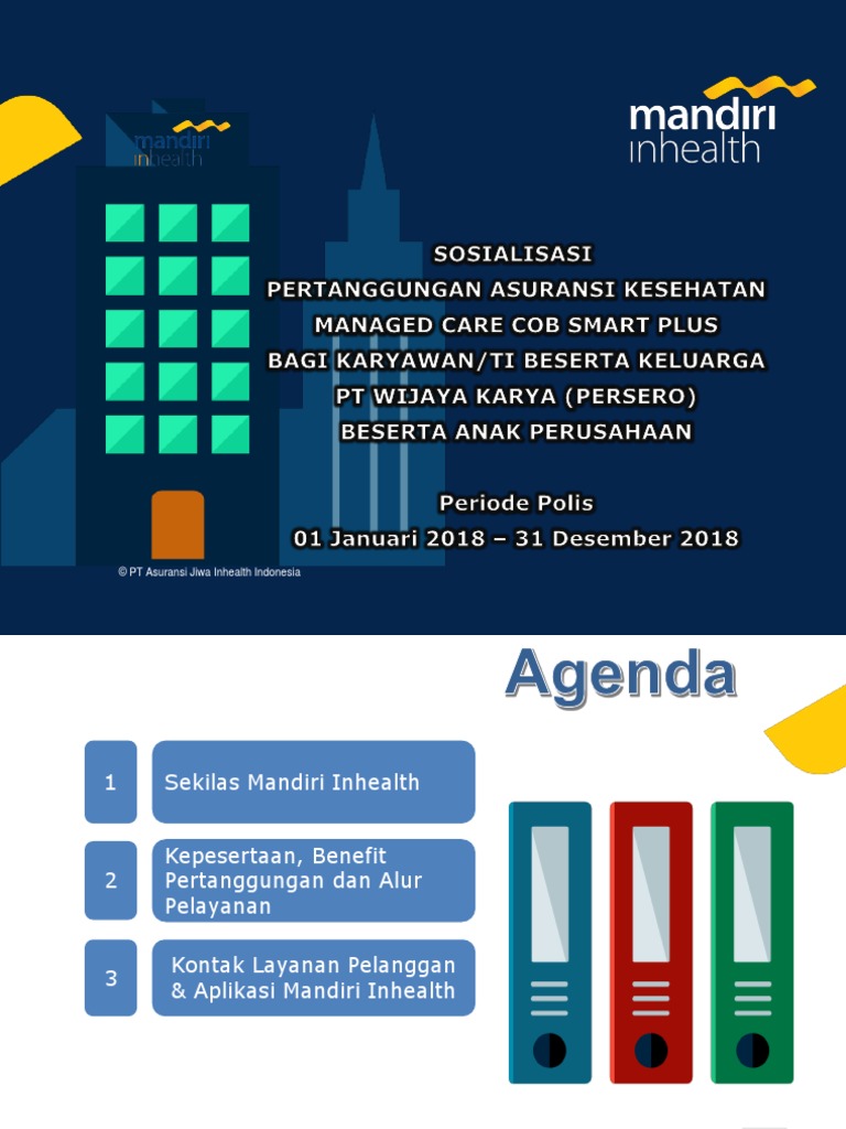 Mandiri InHealth Investasi & Asuransi (Mandiri Inhealth) (Saatnya) Nikmati manfaat dari perlindungan jiwa bagi Anda dan keluarga tercinta. Manfaat Mandiri Jiwa Sejahtera. ... Untuk produk unit link, nilai investasi adalah nilai unit dengan menggunakan harga beli unit pada hari berikutnya. Harga unit dapat berubah sewaktu-waktu. Mandiri Inhealth PT Asuransi Jiwa Inhealth Indonesia (Inhealth) telah memulai perjalanan bisnis di bidang penyedia program jaminan kesehatan komersial sebagai unit bisnis dari PT Askes (Persero) sejak tahun 1992. Ketika itu, kami menyelenggarakan program jaminan kesehatan komersial dengan sistem managed care untuk perusahaan swasta, BUMN, dan institusi ... Mandiri Inhealth - Manfaat, Premi Asuransi, dan Cara Klaimnya Jenis asuransi Mandiri Inhealth dan manfaatnya Hingga kini perusahan asuransi Mandiri memiliki enam pilihan asuransi kesehatan dan asuransi jiwa yang dapat kamu pilih sesuai kebutuhan. Enam asuransi tersebut merupakan asuransi perorangan/individual dan asuransi kumpulan/grup.