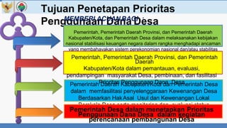 Prioritas Penggunaan Dana Desa Tahun 2020 - Academia.edu Pasal 18 (1) Penetapan prioritas penggunaan Dana Desa sesuai dengan prosedur perencanaan pembangunan Desa yang dilaksanakan berdasarkan kewenangan Desa. (2) Kewenangan Desa sebagaimana dimaksud pada ayat (1) terdiri dari: a. kewenangan Desa berdasarkan hak asal-usul; dan b. kewenangan lokal berskala Desa.