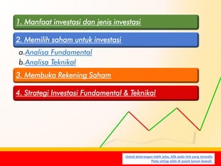 MEKANISME DAN STRATEGI BERINVESTASI DI PASAR MODAL - Ilmu ... STRATEGI BERINVESTASI DI PASAR MODAL. 1. Sebelum berinvestasi di pasar modal investor harus memahami beberapa hal berikut: a. Dana diinvestasikan di pasar modal merupakan dana lebih, bukan dana yang akan digunakan sehari-hari, juga bukan dana cadangan atau dana darurat. b. INVESTASI DAN PASAR MODAL - ratnaran Hubungan investasi dengan pasar modal ialah, pasar modal merupakan wadah bagi para investor untuk menanamkan modalnya agar terus berkembang. Pasar modal merupakan suatu fasilitas untuk mempemudah para investor. PASAR MODAL Pengertian Pasar Modal 5 Strategi Pemasaran Untuk Produk Investasi Strategi pemasaran produk investasi menjadi poin penting dalam menjalankan bisnis. Terlebih saat ini sudah ada banyak strategi yang bisa kamu terapkan di zaman yang serba canggih. Kali ini akan dijelaskan mengenai 5 Strategi pemasaran untuk produk investasi. STRATEGI INVESTASI DI PASAR MODAL - novarian200 Apr 07, 2015 · strategi investasi di pasar modal Investor harus menyadari bahwa berinvestasi di pasar modal disamping akan memperoleh keuntungan juga ada kemungkinan akan mengalami kerugian. Strategi dasar investor yang akan meningkatkan kinerja atau nilai portofolio investasi menjadi lebih baik adalah dengan senantiasa mengikuti prinsip “ Keep your alpha ...