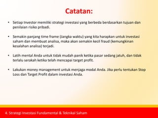 Bukan Soal Nominal, Pahami Sederet Strategi Sebelum ... Untuk berinvestasi di pasar modal, khususnya pada instrumen saham dan reksa dana, terdapat dua jenis analisis yang dapat dilakukan, yaitu fundamental dan teknikal. Analisis fundamental yaitu analisis yang bertujuan mempelajari hal-hal yang berhubungan dengan kondisi keuangan perusahaan tertentu.