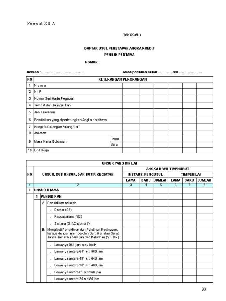 Daftar usulan penetapan angka kredit. anitanet.staff.ipb.ac.id › arsiparis › diklatCara Menghitung Angka Kredit Arsiparis Tingkat Ahli – Anita's ... Cobalah untuk menghitung angka kredit tersebut, berapa jumlah angka kredit dari Unsur Utama dan Unsur Penunjang, kemudian buat Surat Pernyataan telah melakukan kegiatan yang diperlukan, serta tuangkan dalam Daftar Usul Penetapan Angka Kredit (DUPAK) Jawab: Contoh Pengisian Daftar Usul Penetapan Angka Kredit (DUPAK ... Daftar Pengusul Penetapan Angka Kredit (DUPAK) adalah formulir yang berisi keterangan perorangan dosen dan butir kegiatan yang dinilai dan harus diisi oleh dosen pengusul jabatan fungsional dalam rangka penetapan angka kredit. Persyaratan Waktu Pengusulan Daftar Usulan Penilaian Angka ... 69 BAB III PENGUSULAN, PENILAIAN DAN PENETAPAN ANGKA KREDIT A. PENGUSULAN ANGKA KREDIT 1. Pejabat Pengusul Pejabat yang berwenang mengajukan usul Penetapan Angka Kredit adalah : a. Pimpinan unit kerja eselon II pada Dep jdih.anri.go.id › peraturan › Perka_5_2017PERATURAN KEPALA ARSIP NASIONAL REPUBLIK INDONESIA ... - ANRI 17. Penetapan Prestasi Kerja Arsiparis adalah meliputi penetapan Angka Kredit Kumulatif Tahunan, dan penetapan Angka Kredit Kumulatif. 18. Nilai Kinerja yang selanjutnya disingkat NK adalah jumlah nilai SKP ditambah dengan nilai Prilaku yang dikonversikan menjadi Angka Kredit Kumulatif. 19.