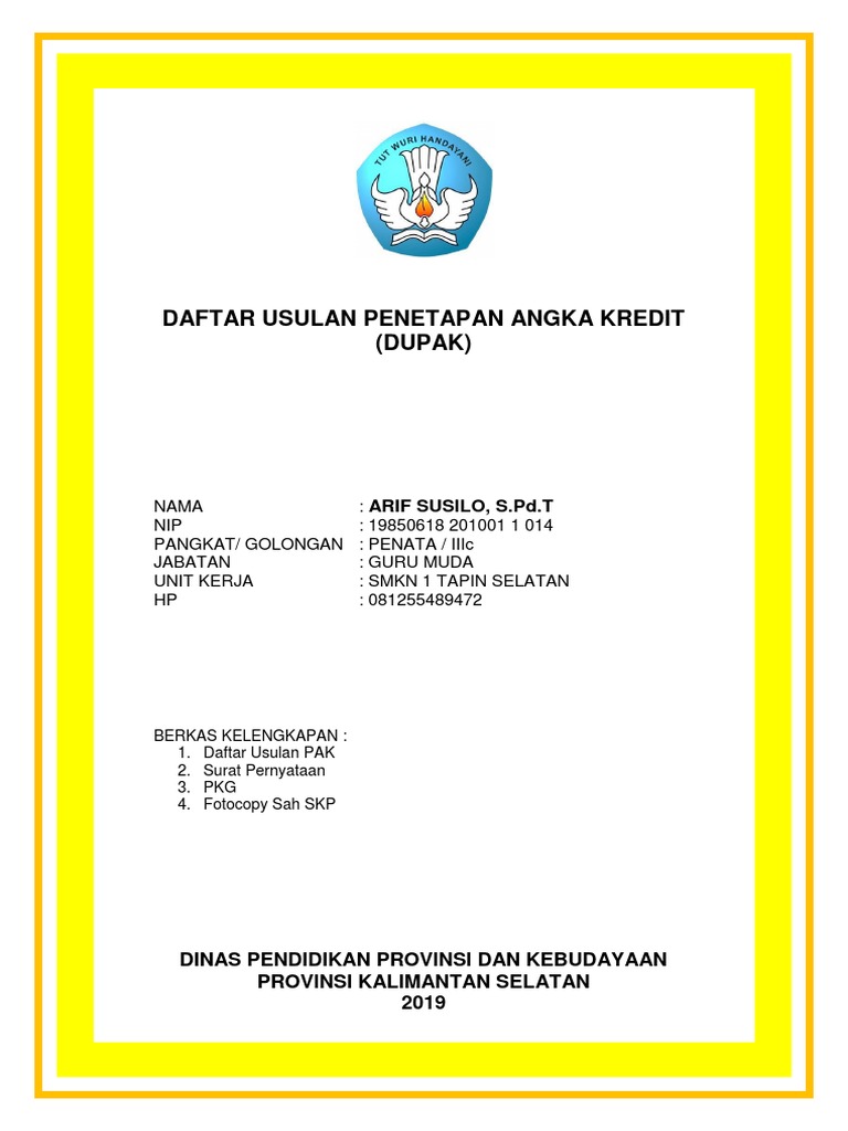 Usulan Penilaian Angka Kredit (PAK) Dan Kenaikan Pangkat ... Guru menyiapkan berkas-berkas usulan dalam 2 bendel sebagai berikut : Daftar Usul Penetapan Angka Kredit (DUPAK). Surat Pernyataan Melaksanakan Tugas Pembelajaran Surat Pernyataan Melaksanakan Kegiatan Pengembangan Keprofesian Berkelanjutan (PKB) Surat Pernyataan Melakukan Kegitaan Penunjang Tugas Guru. Surat Pernyataan Melakukan PBM