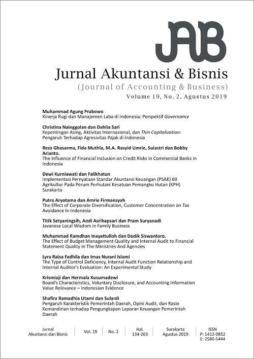 Jurnal Akuntansi dan Bisnis Jurnal Akuntansi dan Bisnis (JAB)is published by Accounting Study Program, Faculty of Economics and Business, Universitas Sebelas Maret, Indonesia. Published two times a year, February and August, JAB is a media of communication and reply forum for scientific works especially concerning the field of the business and accounting.