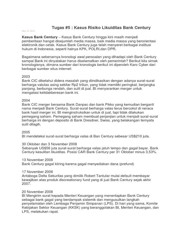 Kasus bank century dan penyelesaiannya. Kronologi Aliran Rp 6,7 Triliun ke Bank Century - Nasional ... Laporan tersebut mengungkapkan banyak kelemahan dan kejanggalan serius di balik penyelamatan Bank Century dan ada dugaan pelanggaran kebijakan dalam memberikan bantuan ke Bank Century. Akibat kejanggalan temuan tersebut, Sekjen PDI Perjuangan Pramono Anung membentuk tim kecil untuk menggulirkan hak angket guna mengkaji kasus Bank Century. KASUS SENGKETA BANK CENTURY - desiprastiowati Untuk Bank-bank nasional lainnya pengaruh kasus Bank Century mengakibatkan hampir terjadinya efek domino dikarenakan masyarakat menjadi kurang percaya dan takut bila bank-bank nasional lainnya memiliki "penyakit" yang sama dengan Bank Century dikarenakan krisis global, dengan kata lain merusak nama baik bank secara umum. (DOC) analisis kasus Bank Century | Nury Andhiny ... Kasus Bank century hingga kini masih menjadi pemberitaan hangat di sejumlah media massa. Kasus Bank Century juga telah menyeret berbagai institusi hukum di Indonesia, seperti halnya KPK, POLRI dan DPR. Kasus Bank Century juga mengakibatkan kompetensi dan kredibilitas Akuntan (Auditor) diragukan. Penyelesaian Kasus Bank Century dan Solusinya | satriobudhi Penyelesaian Kasus Bank Century dan Solusinya Penjabaran Kasus Bank Century Krisis yang dialami Bank Century bukan disebabkan karena adanya krisis global, tetapi karena disebakan permasalahan internal bank tersebut. Permasalahan internal tersebut adalah adanya penipuan yang dilakukan oleh pihak manajemen bank terhadap nasabah menyangkut: