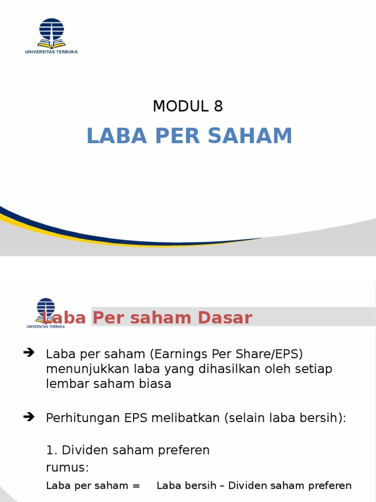 Cara Menghitung Earning Per Share | Rumus EPS Maka, laba bersih per saham adalah Rp. 150.375.000,- / 1.000.000 lembar = Rp. 150 / lembar saham (ini sering disebut juga dengan EPS atau earning per share. Dari sinilah, Danny dan Grace bisa menghitung berapa porsi laba atas kepemilikan saham perusahaan mereka masing - masing bukan? PPTX Fase 2 - Universitas Indonesia LABA PER LEMBAR SAHAM. Akuntansi Keuangan 2 - Pertemuan 5. Slide OCW Universitas Indonesia. Oleh : Irsyad Dwi Martani. Departemen Akuntansi FEUI