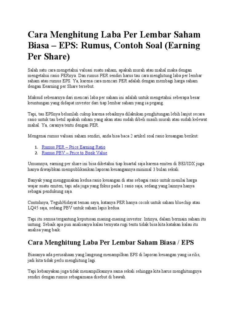 Laba per Saham: Pentingnya Mengetahui EPS dalam ... - Ajaib Untuk menghitungnya cukup mudah, yakni laba bersih yang sudah dikurangi dividen bagi pemegang saham biasa dibagi rata-rata tertimbang dari saham biasa yang beredar di periode tersebut. Rumus untuk earning per share dasar ini adalah: LPS dasar= (Laba bersih setelah pajak - dividen) / jumlah saham yang beredar