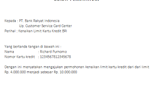 Contoh Surat Permohonan Kenaikan Limit Kartu Kredit ... Surat pernyataan kenaikan kredit limit dikirimkan ke email kartu kredit bank. Sebelum mengirimkan surat permohonan- pemegang kartu wajib menghubungi call center untuk membuat laporan. Sekaligus, untuk menanyakan alamat email kemana dokumen tersebut harus dikirimkan.