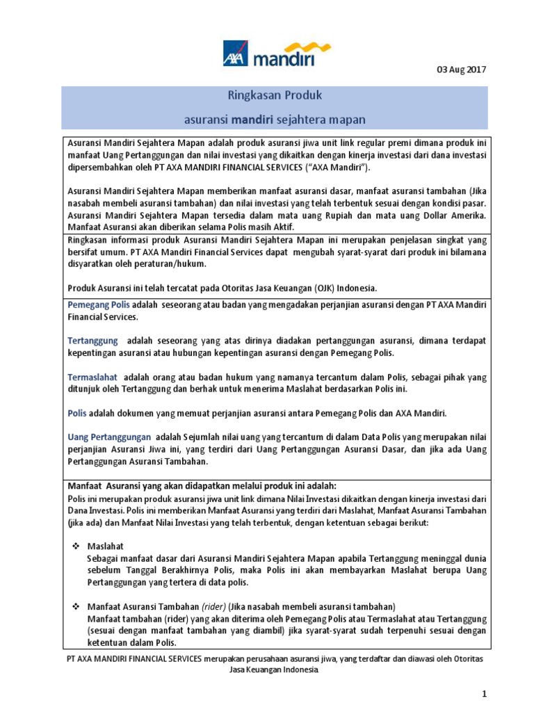 Premi Asuransi Kesehatan AXA Perbulan : Maestro Hospital Plan Terdapat fasilitas pengembalian premi sebesar 70% untuk premi yang dibayarkan dalam waktu 7 tahun. Fasilitas ini akan dibayarkan pada akhir masa pertanggungan (tahun ke-10). Memberikan program bonus dimana akan ada diskon yang diberikan kepada polis yang mendaftarkan anggota keluarganya. Bonus diberikan sebesar 10% dari total premi yang dibayarkan. AXA Mandiri Travel* - axa-mandiri.co.id Asuransi Perjalanan AXA* Nikmati kenyamanan perjalanan bisnis maupun liburan dengan manfaat perlindungan menyeluruh bagi Anda serta keluarga. PT Mandiri AXA General Insurance menyediakan Asuransi Perjalanan Internasional meliputi negara SCHENGEN (Perancis, Jerman, Belanda, dll), negara Non-SCHENGEN (Jepang, Inggris, Korea dll), negara ASEAN Plus (Hongkong, Thailand, Filipina, dll). Asuransi Solusi Kesehatan Keluarga | AXA Mandiri - axa ... Asuransi Mandiri Perlindungan Sejahtera Syariah - Solusi Asuransi Masa Depan Syariah. Asuransi Mandiri Proteksi Kesehatan Syariah. Asuransi Mandiri Penuh Cinta Syariah (SiPeci Syariah) Perlindungan Umum. Asuransi Mandiri AXA Hospital Plan. Asuransi Mandiri Mobil. Asuransi Mandiri Properti. Ingin Mencairkan Dana Asuransi AXA Mandiri ... - Lifepal Media Pada AXA Mandiri, minimal saldo yang dapat ditarik sebesar Rp1 juta dengan sisa saldo Rp5 juta per polis. Jika jumlah yang akan ditarik mengakibatkan saldo investasi jauh di bawah minimal, standar minimal penarikan sudah tidak berlaku lagi. Penarikan langsung diberlakukan dalam perhitungan maksimal.