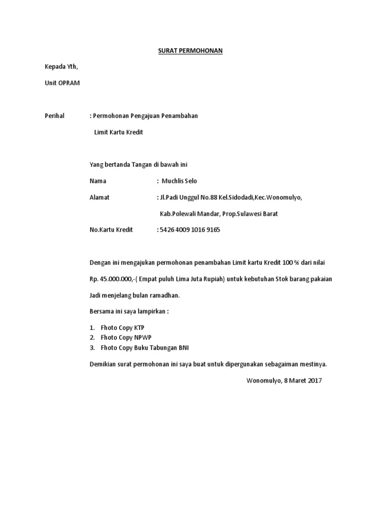 Contoh Surat Pengajuan Kenaikan Limit Kartu Kredit Bni ... Cara Menaikan Limit Kartu Kredit Bri Blog Sederhana. Contoh Surat Permohonan Penambahan Limit Kartu Kredit. ... Syarat Pembukaan Kartu Kredit Cimb Niaga Syariah. Demikian informasi yang dapat kami bagikan mengenai contoh surat pengajuan kenaikan limit kartu kredit bni. Terima kasih telah berkunjung ke blog Bagi Contoh Surat 2019.