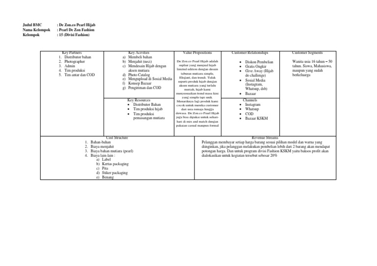 Contoh Bisnis Model Canvas Hijab - Indorsie Segmen pelanggan sesuai dari produk ini tentunya adalah semua perempuan yang mengenakan hijab selama beraktivitas sehari-hari. Jilbab ini dapat digunakan pada usia minimal yakni 10 tahun, dimana umur ini masih belum memahami cara berpakaian untuk terlihat lebih menarik atau bisa dikatakan jika mereka akan mengikuti apa kata orang tuanya. Berbeda dengan perempuan yang berusia di atas 10 tahun pastinya akan memiliki kecenderungan untuk menampilkan fashion terbaik dan benar. Umumnya segmen pelanggan ini lebih cocok di kawasan perkotaan lantaran banyaknya aktivitas masyarakat kota sehingga menuntut mereka agar selalu memperbaiki penampilan terutama wanita berhijab. Sebenarnya memperluas segmen bisnis ke masyarakat desa juga bisa, namun tergantung pada situasi dan kondisi bisnis anda. Sebab ada beberapa peluang usaha di desa, boleh jadi tidak sama dengan di wilayah kota atau sebaliknya. Maka penting untuk menentukan segmen dan wilayah pasar dengan baik. Apa Itu Business Model Canvas, Contoh, dan Cara Membuatnya Apa itu Business Model Canvas? 9 Elemen dalam Business Model Canvas 1. Customer Segments (Segmentasi konsumen) 2. Value Proposition (Proposisi nilai konsumen) 3. Channels (Saluran) 4. Customer Relationship (Hubungan konsumen) 5. Revenue Streams (Sumber pendapatan) 6. Key Resource (Sumber daya) 7. Key Activities (Aktivitas yang dijalankan) 8. Contoh Bisnis Model Canvas Pakaian - Memberi Catatan Feb 11, 2022 · Contoh bisnis model canvas pakaian. Tidak mengherankan, karena perjuangan kebanyakan pengusaha melalui cara ini. Kondisi persaingan penjualan produk fashion di kota bandung semaking tinggi. Berikut adalah business model canvas dari rencana bisnis shashu shoes yang akan saya kembangkan: