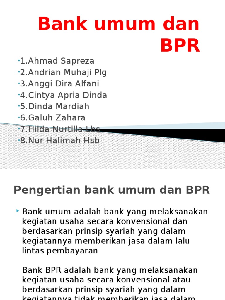 Perbedaan Bank Umum dan BPR - Bank Bahtera Masyarakat Perbedaan Kegiatan Usaha Bank umum dan BPR 1. Kegiatan Usaha Bank Umum Menghimpun dana dari masyarakat dalam bentuk simpanan berupa giro, deposito berjangka, sertifikat deposito, tabungan, dan atau bentuk lainnya yang dipersamakan dengan itu. Memberikan kredit. Menerbitkan surat pengakuan utang. Perbedaan Bank Umum, Bank Perkreditan Rakyat, dan Bank ... Perbedaan Bank Umum, Bank Perkreditan Rakyat, dan Bank Syariah: 1. P erbedaan dari segi pengertian bank umum yaitu bank yang melaksanakan kegiatan usaha secara konvensional dan/atau berdasarkan prinsip syariah yang dalam kegiatannya memberikan jasa dalam lalu lintas pembayaran. Bank Perkreditan Rakyat merupakan bank yang melaksanakan kegiatan usaha secara konvensional dan/atau berdasarkan ...