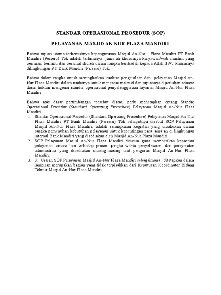 Standar operasional prosedur bank mandiri. Tinjauan Terhadap Standar Operasional Prosedur (Sop ... frestly, amelia shinta (2014) tinjauan terhadap standar operasional prosedur (sop) customer service pada bank syariah mandiri cabang lubuk basung. diploma thesis, universitas andalas. › 42703431 › Fungsi_FungsiFungsi-Fungsi Manajemen "P-O-A-C" - Academia.edu Standar juga harus jelas, spesifik dan terukur; sehingga persepsi semua orang sama, disamping dapat memberikan arahan yang jelas, motivasi, juga mengurangi konflik karena misintrepretasi. Dengan adanya standar penilaian, maka dapat diperkirakan hasilnya sebelum selesai, dengan demikian dapat diantisipasi sebelumnya. PDF Penerapan Sop (Standar Operasional Prosedur) Frontliner ... Skripsi minor ini berjudul "PENERAPAN SOP (STANDAR OPERASIONAL PROSEDUR) FRONTLINERDALAM MENINGKATKAN KEPUASAN NASABAH PADA BANK SUMUT KCP SYARIAH HM. JONI MEDAN" telah diuji dalam sidang munaqasyah Fakultas Ekonomi dan Bisnis Islam Universitas Islam Negeri Sumatera Utara Medan, Pada taggal 20 April 2018. Kebijakan Manajemen Risiko PT Bank Mandiri (Persero) Tbk. Seluruh kebijakan dan prosedur di Bank Mandiri merupakan bentuk pengelolaan risiko yang melekat pada setiap aktivitas operasi Bank yang dievaluasi dan di-update minimal sekali dalam setahun. 3. Kecukupan Proses Identifikasi, Pengukuran, Pemantauan, dan Pengendalian Risiko, Serta Sistem Informasi Manajemen Risiko